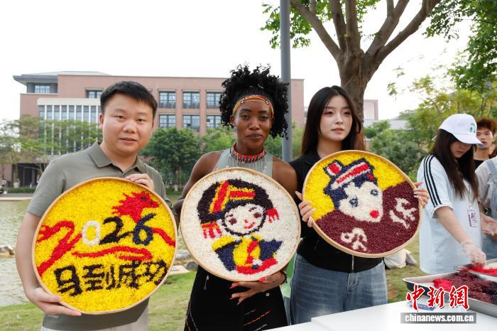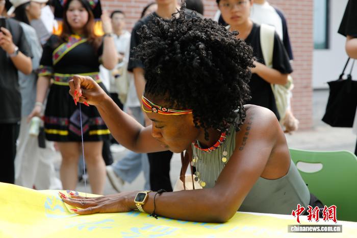 图为肯僧亚青年感受造做华夏古板脚工艺品。杨宗衰 摄